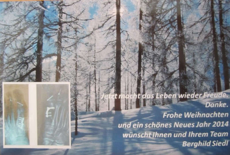 Sehr geehrter Herr Dr.Vitek! Ein Jahr geht schon wieder dem Ende zu und ich möchte mich wie jedes Jahr bei Ihnen für die perfekte Op beider Halux bedanken. Es geht mir blendend und das verdank ich Ihnen. Geruhsame Feiertage Ihre Berghild Siedl🎄