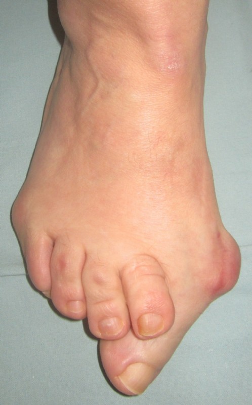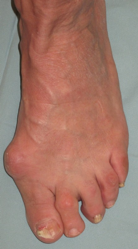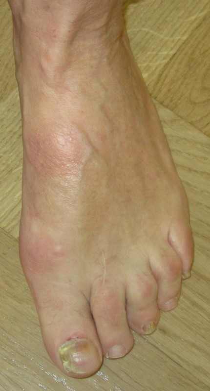 Der Fuß war bereits auswärtig voroperiert. Die Patientin leidet an entzündlichem Rheumatismus und hatte starke Schmerzen.