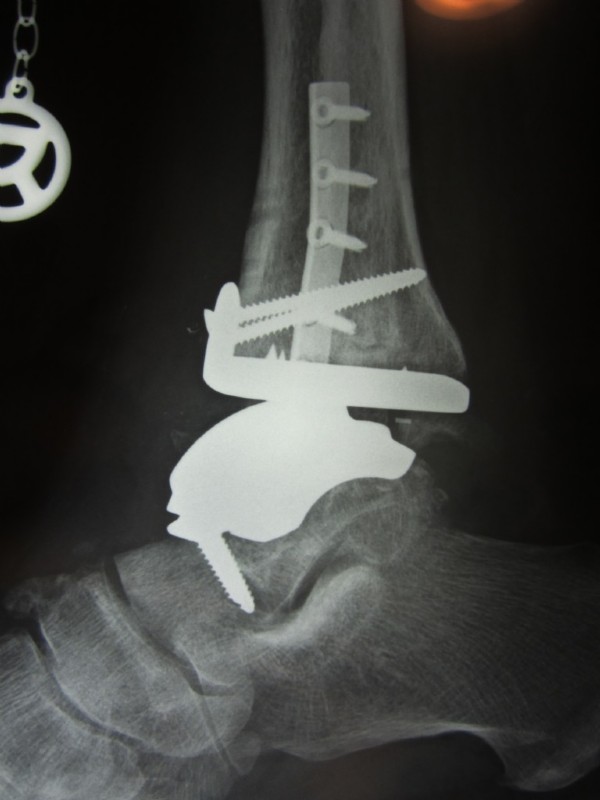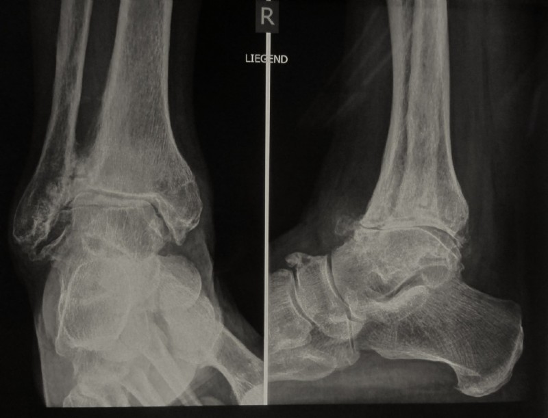 Schwere Zerstörung des Sprunggelenkes mit komplettem Verschleiß der Gleitschicht (Knorpel) und massiven Auflagerungen aus Knochen in Form von Leisten und Spornen. Entrundung und Teilverrenkung des Sprungbeines. Keine Beweglichkeit mehr im oberen Sprunggelenk und starke Ruhe- und Belastungsschmerzen.