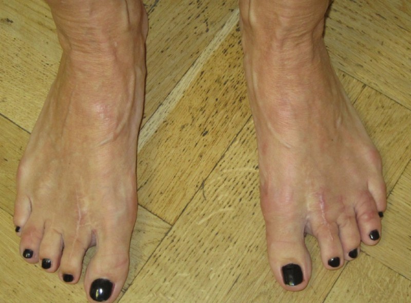 Nach Geradestellung der Großzehen, Verlängerung und Geradestellung der II und III Zehen und Verkürzung und Geradestellung der IV Zehe ist das Ergebnis dauerhaft kosmetisch und funktionell zur Zufriedenheit der Patientin.