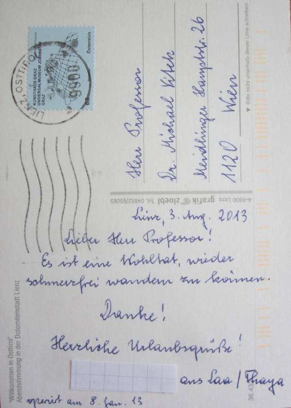 Frau I.G. bedankt sich mit einer Ansichtskarte aus den Lienzer Dolomiten, wo sie 6 Monate nach der Operation einen Wanderurlaub verbrachte.