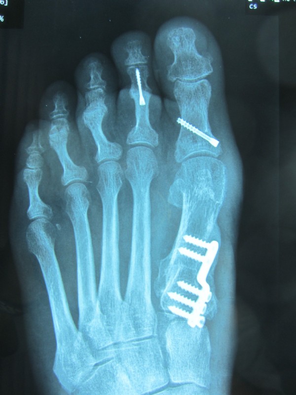 Das Röntgenbild zeigt die Korrektur des linken Fußes mit Basisosteotomie und Korrektur der Hammerzehe an der 2. Zehe.