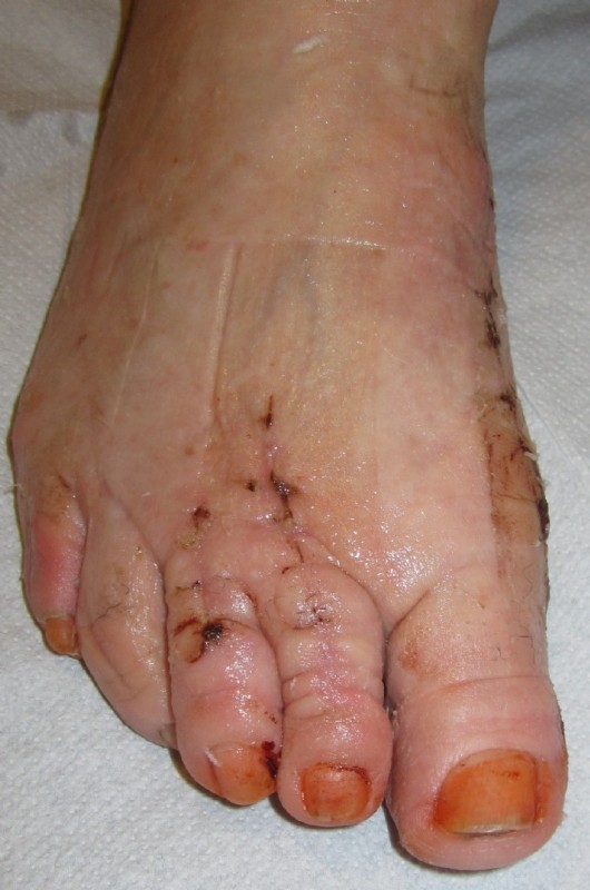 Die Voroperationen führten zu fast grotesken Zehendeformitäten mit massiven Verkürzungen und Abweichungen und einer "funktionellen Amputation" der II und III Zehe.