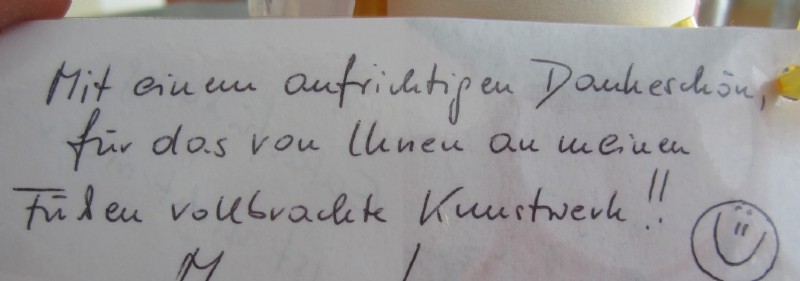 Mit einem aufrichtigen Dankeschön für das von Ihnen an meinen Füßen vollbrachte Kunstwerk.