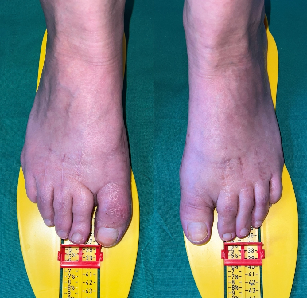 Nach der Verkleinerung beider Füße hat die Patientin nur noch Schuhgröße 38,5. Zusätzlich haben wir auch noch die beiden Großzehen geradegestellt.